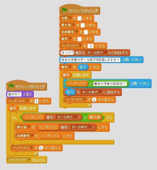 | 5 最大値 8名のボール投げの結果について、一番遠くに投げた児童の出席番号と距離を求めるプログラムを作成しましょう。 |