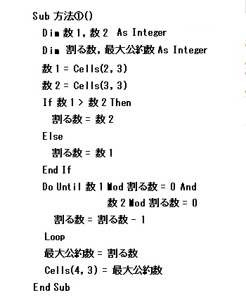 大きい方の数を小さい方の数で割って余りを求め、この余りで小さい方の数を余りで割る。このことを余りが0になるまで繰り返して見つける(ユークリッド互除法)プログラム